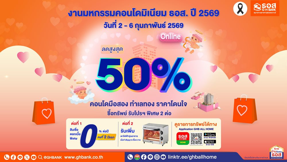ธนาคารอาคารสงเคราะห์ (ธอส.) รุกตลาดอสังหาริมทรัพย์มือสองรับต้นปี จัดมหกรรมคอนโดมิเนียม ธอส. ปี 2569 (Online) นำทรัพย์เด่น ทำเลทองกว่า 600 รายการ ลดราคาสูงสุด 50% จากราคาปกติ พร้อมโปรโมชันพิเศษ 2 ต่อ!!