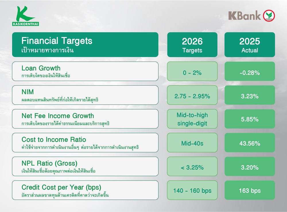 นางสาวขัตติยา อินทรวิชัย ประธานเจ้าหน้าที่บริหาร ธนาคารกสิกรไทย เปิดเผยว่า กลยุทธ์ของธนาคารกสิกรไทยยังคงมุ่งเน้นไปที่การเติบโตอย่างสมดุล เสริมความแข็งแกร่งท่ามกลางภาวะเศรษฐกิจที่ท้าทาย โดยธนาคารได้กําหนดเป้าหมายทางการเงินประจำปี 2569 ดังนี้