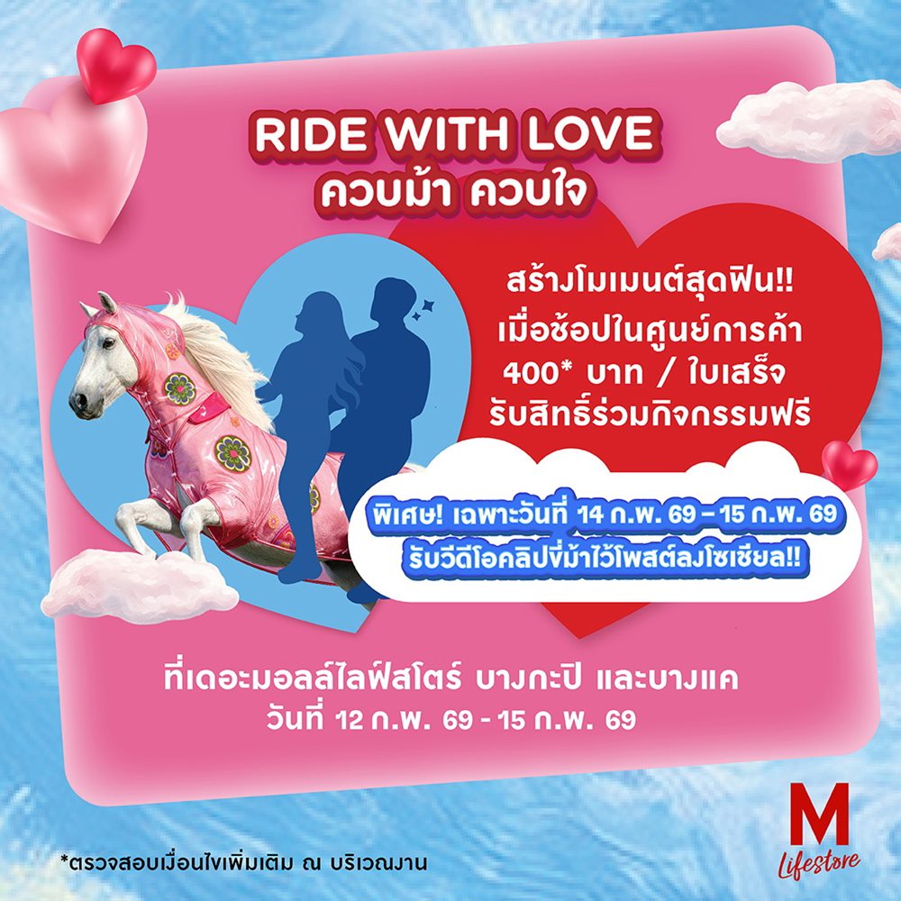 •Ride with Love กิจกรรมขี่ม้าสร้างคอนเทนต์สุดไวรัล ชวนคู่รัก และคนโสด สัมผัสประสบการณ์ขี่ม้าทำคอนเทนต์สุดน่ารักตามฉ่งชิ่งโมเดล เพียงช้อปครบ 400 บาท รับสิทธิ์ร่วมกิจกรรมและถ่ายวีดีโอฟรี ระหว่างวันที่ 12–15 กุมภาพันธ์ 2569 ที่ เดอะมอลล์ไลฟ์สโตร์ บางกะปิ
