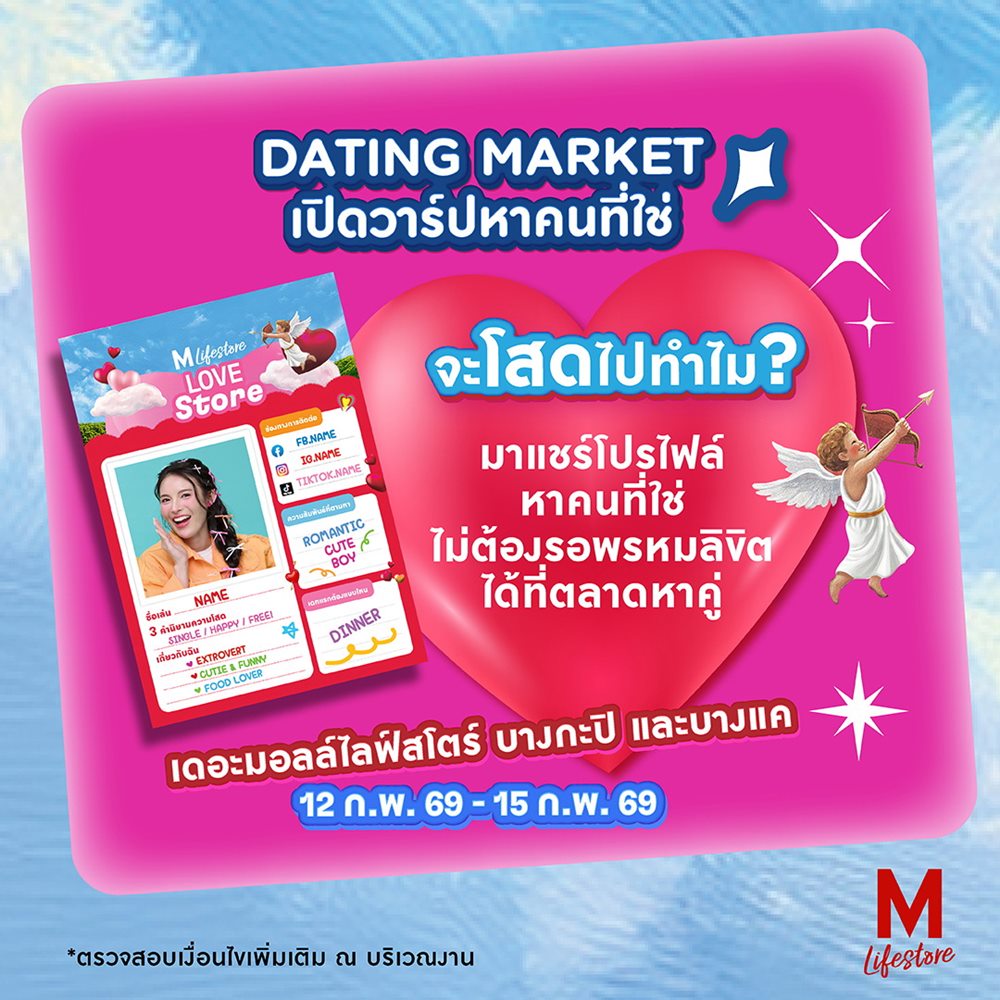 •Dating Market ตลาดนัดหาคู่ที่ใหญ่ที่สุดในกรุงเทพตะวันออก เพียงกรอกประวัติ ความสนใจส่วนตัว พร้อม IG ลงในเรซูเม่ แล้วติดลงบนบอร์ดภายในงาน เพื่อตามหาคนที่ใช่สำหรับคุณ ระหว่างวันที่ 12–15 กุมภาพันธ์ 2569 ที่ เดอะมอลล์ไลฟ์สโตร์ บางกะปิ และบางแค