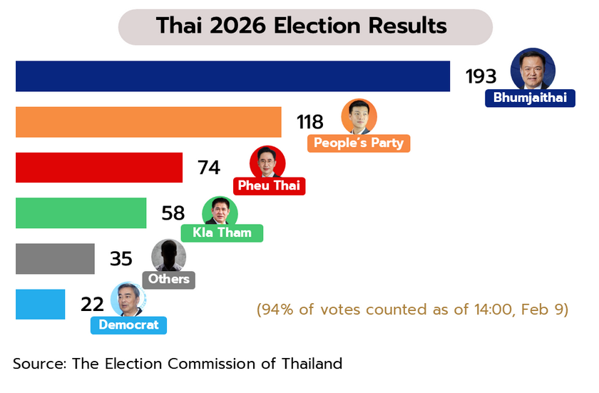 ไทย: ผลการเลือกตั้งทั่วไปเมื่อวันที่ 8 กุมภาพันธ์ พรรคภูมิใจไทยได้ที่นั่งในสภาฯ เกินคาด โดยก้าวขึ้นมาเป็นพรรคที่มีจำนวนสมาชิกสภาผู้แทนราษฎร (สส.) มากที่สุด ด้วยจำนวนที่นั่งประมาณ 190–195 ที่นั่ง จากทั้งหมด 500 ที่นั่งในสภาผู้แทนราษฎร จึงกลายเป็นพรรคแกนนำในการจัดตั้งรัฐบาล ทั้งนี้ พรรคภูมิใจไทยอาจจับมือกับพรรคกล้าธรรม (ซึ่ง ณ วันที่ 9 ก.พ. มี 58 ที่นั่ง) เพื่อจะครองเสียงข้างมากในสภาฯ ซึ่งหากรวมจำนวนที่นั่งกับพรรคเพื่อไทย (ประมาณ 74 ที่นั่ง) และ/หรือพรรคขนาดเล็กอื่น ๆ จะทำให้มีจำนวน สส. รวมมากกว่า 300 ที่นั่ง