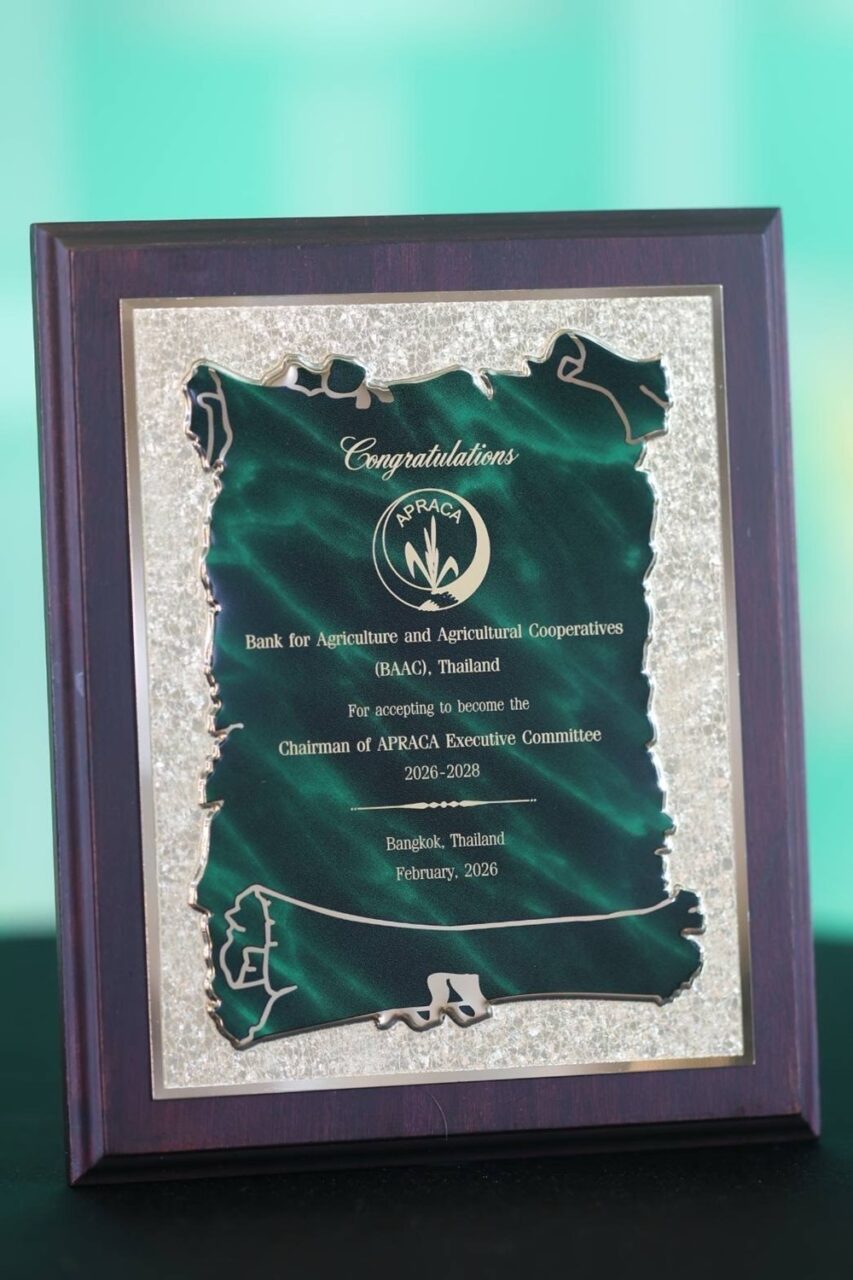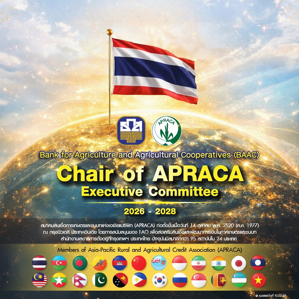 ให้กับนายฉัตรชัย ศิริไล ผู้จัดการ ธ.ก.ส. ซึ่งจะดำรงตำแหน่งประธานคณะกรรมการบริหาร APRACA เป็นระยะเวลา 2 ปี (2569 – 2571) และเป็นอีกหนึ่งบทบาทสำคัญในการยกระดับบทบาทของประเทศไทยและ ธ.ก.ส. ในการผลักดันความร่วมมือด้านการสนับสนุนเงินทุนและการพัฒนาเกษตรกรรมของภูมิภาคในระยะยาว โดย ธ.ก.ส. พร้อมเป็นกลไกสำคัญในการสนับสนุนการพัฒนาภาคเกษตรและชนบท ควบคู่กับการเสริมสร้างความร่วมมือระดับภูมิภาคและระหว่างภูมิภาค ผ่านกลไกการเป็นแกนกลางการเกษตร (Essence of Agriculture) เพื่อยกระดับคุณภาพชีวิตเกษตรกรและเสริมสร้างความเข้มแข็งเศรษฐกิจฐานรากอย่างมั่นคงและยั่งยืน โดยมีนายเกรียงไกร กัลหะรัตน์ รองผู้จัดการ ธ.ก.ส. นางสาวพรหมกร พรหมขัติแก้ว ผู้ช่วยผู้จัดการ ธ.ก.ส. และสถาบันการเงินสมาชิก เข้าร่วมประชุม เมื่อวันที่ 10 กุมภาพันธ์ 2569 ณ โรงแรม Centara Grand at Central Plaza Ladprao กรุงเทพฯ