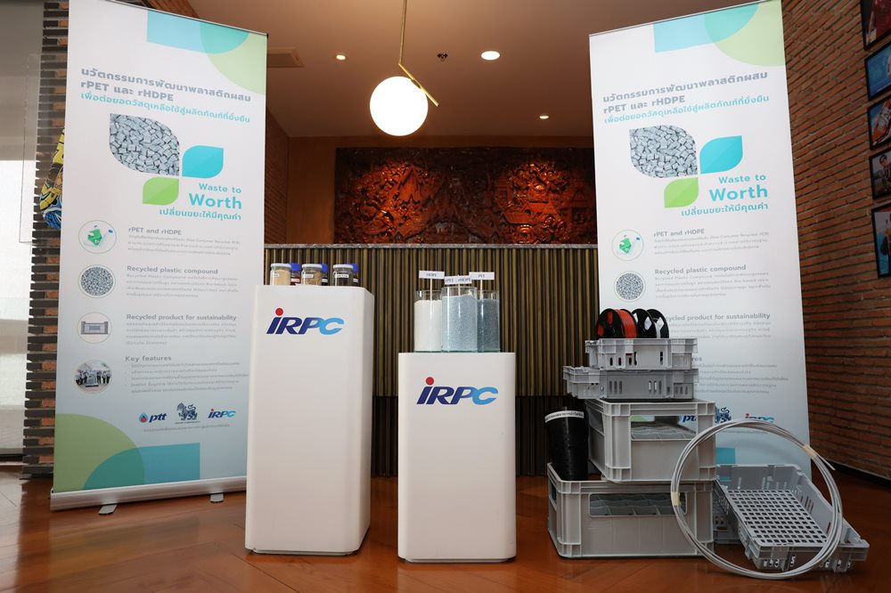 บริษัท ปตท. จำกัด (มหาชน) บริษัท ไออาร์พีซี จำกัด (มหาชน) และ บริษัท บุญรอดบริวเวอรี่ จำกัดร่วมแถลงความสำเร็จการพัฒนานวัตกรรมพลาสติกรีไซเคิลผสม (rPET และ rHDPE) เพื่อต่อยอดสู่ผลิตภัณฑ์ยั่งยืนตามแนวคิด Circular Economy ที่ลงนามความร่วมมือไปเมื่อเดือนพฤศจิกายน 2566 โดยมี นายประสงค์ อินทรหนองไผ่ ประธานเจ้าหน้าที่ปฏิบัติการกลุ่มธุรกิจปิโตรเลียมขั้นปลาย บริษัท ปตท. จำกัด (มหาชน) (ซ้าย)นายเทอดเกียรติ พร้อมมูล ประธานเจ้าหน้าที่บริหารและกรรมการผู้จัดการใหญ่ บริษัท ไออาร์พีซี จำกัด (มหาชน) (ขวา) และนายปิติ ภิรมย์ภักดี กรรมการรองกรรมการผู้จัดการใหญ่อาวุโส และ ประธานเจ้าหน้าที่บริหาร กลุ่มบริษัทผลิต บริษัท บุญรอดบริวเวอรี่ จำกัด (กลาง)ร่วมพิธี