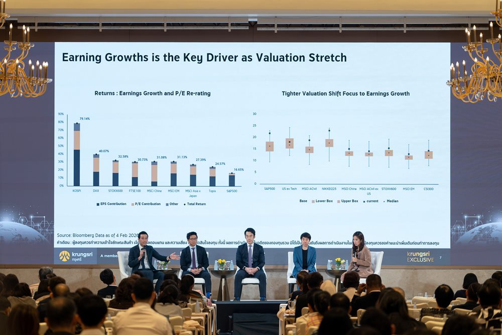 ธนาคารกรุงศรีอยุธยา จำกัด (มหาชน) และบริษัทในเครือ) จัดงานสัมมนา KRUGNSRI EXCLUSIVE Investment Outlook 2026: Building Resilient Portfolios in Volatile World โดยได้รับเกียรติจากผู้เชี่ยวชาญด้านเศรษฐกิจและการลงทุนของกรุงศรี และพันธมิตร อัปเดตมุมมองเศรษฐกิจและเทรนด์การลงทุนปี 2569 ให้กับลูกค้ากรุงศรี เอ็กซ์คลูซีฟ สรุปใจความสำคัญว่าปี 2569 แม้เริ่มเห็นสัญญาณเศรษฐกิจเข้าสู่วัฏจักรฟื้นตัว แต่ความเสี่ยงภูมิรัฐศาสตร์และปัจจัยเชิงโครงสร้างยังเป็นแรงกดดันสำคัญ ขณะที่กลยุทธ์ลงทุนควรให้น้ำหนักหุ้นมากกว่าตราสารหนี้ กระจายความเสี่ยง ลดการกระจุกตัวในหุ้นเทคฯใหญ่สหรัฐฯ ไปยังหุ้นขนาดกลาง-เล็ก หุ้นวัฏจักร และตลาดเกิดใหม่ พร้อมเน้นการบริหารพอร์ตอย่างยืดหยุ่น เพื่อรับโอกาสฟื้นตัวอย่างมีคุณภาพเศรษฐกิจโลก 2569: “โตได้ แต่ไม่ง่าย”