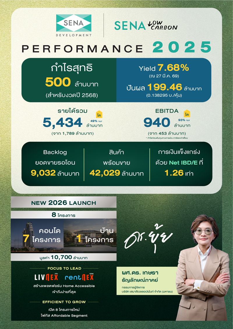 บริษัท เสนาดีเวลลอปเม้นท์ จำกัด (มหาชน) หรือ SENA เผยผลการดำเนินงานปี 2568 เติบโตอย่างโดดเด่น แม้ภาวะตลาดยังถูกกดดันจากเศรษฐกิจและกำลังซื้อภาคครัวเรือนที่ชะลอตัว โดยบริษัทมียอดรับรู้รายได้รวมทุกประเภทธุรกิจ 5,434 ล้านบาท เพิ่มขึ้น 1,789 ล้านบาท เติบโต 49% จากปีก่อนหน้า ขณะที่กำไรขั้นต้นอยู่ที่ 1,661 ล้านบาท เพิ่มขึ้น 537 ล้านบาท เติบโต 48% และมีกำไรก่อนต้นทุนทางการเงิน ส่วนแบ่งกำไรและภาษีเงินได้ 940 ล้านบาท เพิ่มขึ้น 453 ล้านบาท เติบโต 93% สะท้อนประสิทธิภาพในการดำเนินงานและการบริหารต้นทุนที่แข็งแกร่ง พร้อม จ่ายเงินปันผลจากผลการดำเนินงานปี 2568 199.46 ล้านบาท อัตรา 0.138295 บาทต่อหุ้น Dividend Yield ประมาณ 7.68%