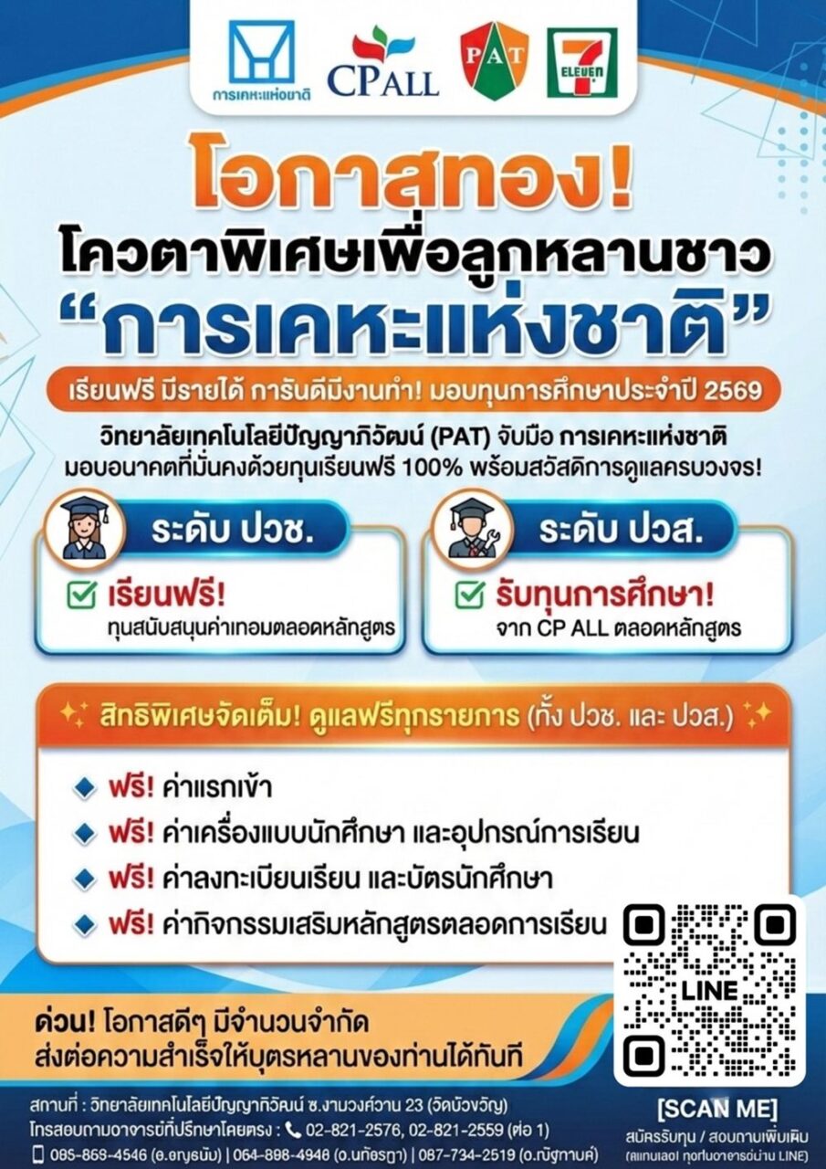 การเคหะแห่งชาติ หนุนการศึกษาเยาวชนจับมือ CP ALL และวิทยาลัยเทคโนโลยีปัญญาภิวัฒน์ มอบทุนการศึกษาหลักสูตร ปวช. และ ปวส. ประจำปีการศึกษา 2569 ให้แก่เยาวชนในชุมชนการเคหะแห่งชาติได้เรียนฟรีตลอดหลักสูตร พร้อมสวัสดิการมีรายได้ระหว่างเรียน สร้างโอกาสสู่การมีงานทำและอนาคตที่มั่นคง