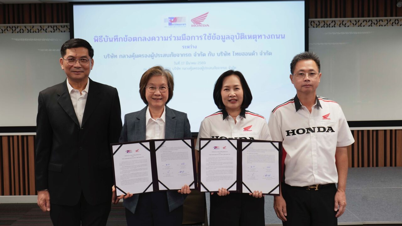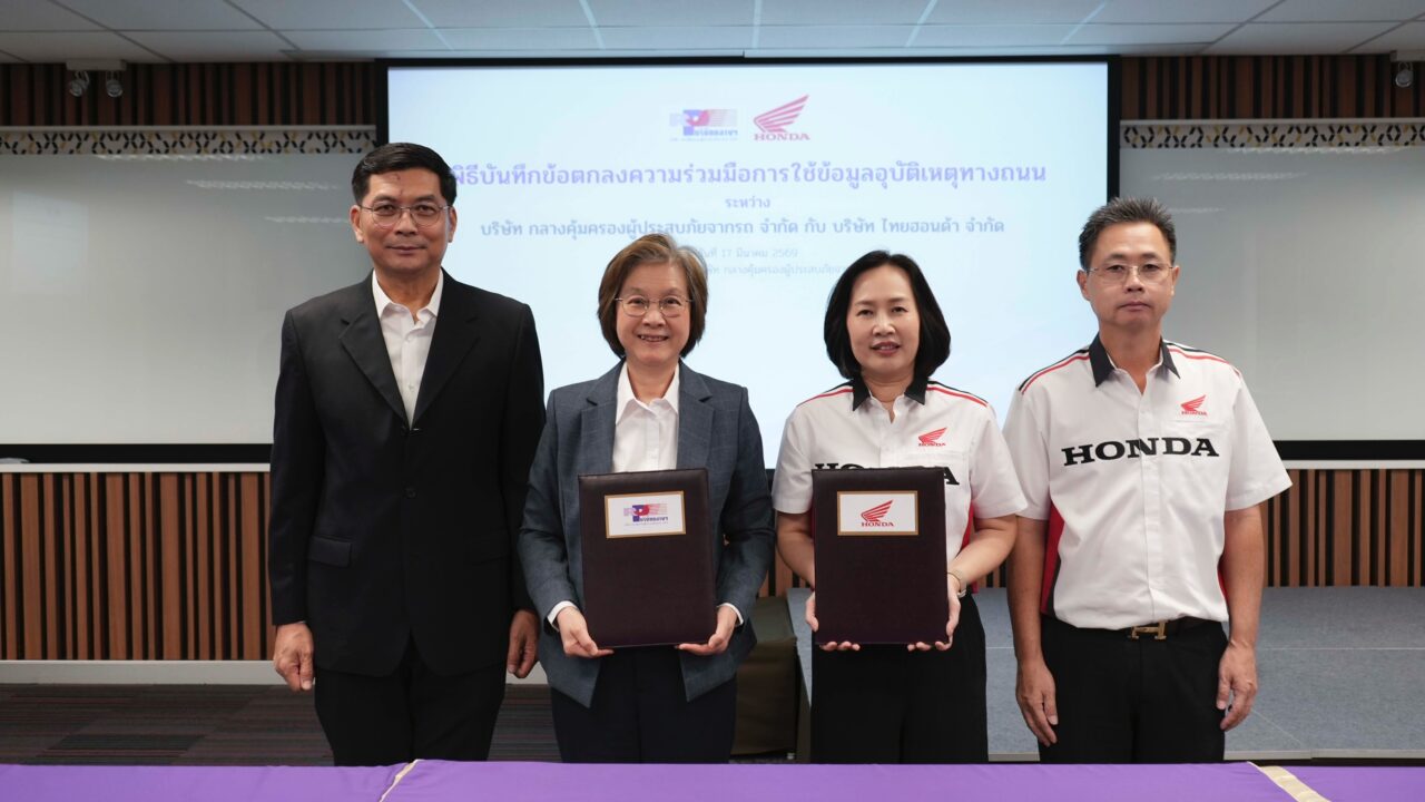 นางสาวพรรณี ปิติกุลตัง กรรมการผู้จัดการ บริษัท กลางคุ้มครองผู้ประสบภัยจากรถ จำกัด พร้อมด้วย นางสาวิตรี แก้วพวงงาม กรรมการบริหาร บริษัท ไทยฮอนด้า จำกัด ร่วมลงนามในบันทึกข้อตกลงความร่วมมือด้านการใช้ข้อมูลอุบัติเหตุทางถนน ความร่วมมือ