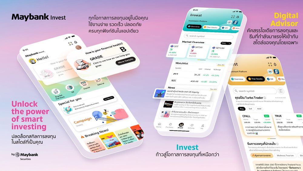 บริษัท หลักทรัพย์ เมย์แบงก์ (ประเทศไทย) จำกัด (มหาชน) เดินหน้ากลยุทธ์ Digital Wealth Platform เต็มรูปแบบ ปรับแพลตฟอร์มการลงทุนครั้งสำคัญ เปิดตัว Maybank Invest Application เวอร์ชันใหม่ ที่ออกแบบมาเพื่อสนับสนุนการลงทุนแบบ Multi-Asset เน้นบริหารพอร์ตการลงทุนอย่างมีระบบ สะท้อนวิสัยทัศน์ของบริษัทที่มุ่งยกระดับบทบาทจากแพลตฟอร์มการซื้อขาย ไปสู่การเป็นพาร์ทเนอร์ด้านการเงินที่ช่วยนักลงทุนสร้างความมั่งคั่งอย่างยั่งยืนในระยะยาว