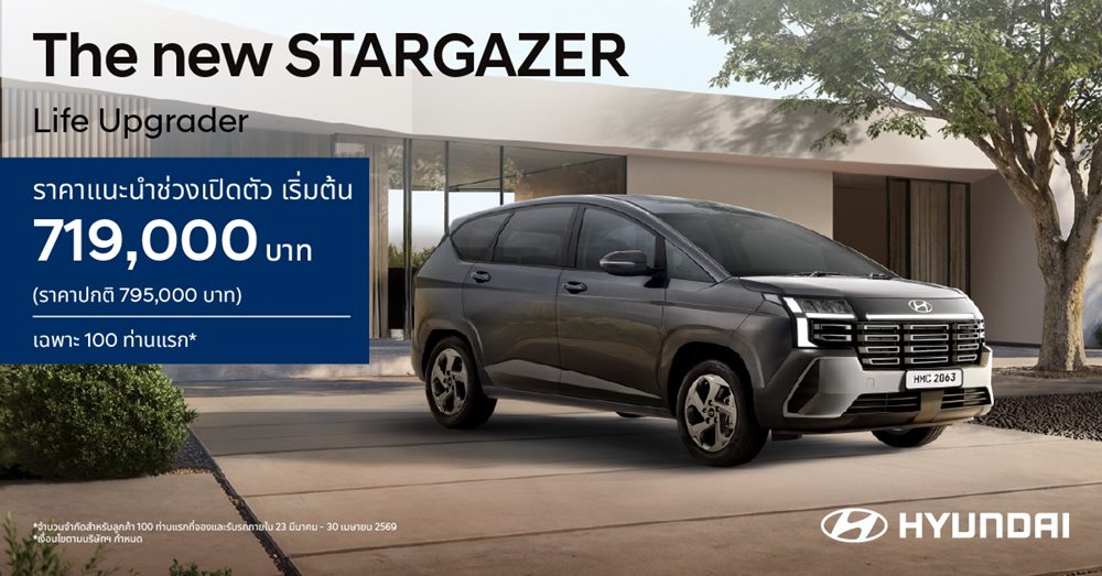 - The new STARGAZER รถ 6 ที่นั่ง มาพร้อมเทคโนโลยีความปลอดภัยอัจฉริยะ Hyundai SmartSense (ADAS) มากถึง 13 ระบบ ครบครันที่สุดในเซกเมนต์ และสะดวกสบายเหนือระดับด้วย Captain Seat เปิดตัวในราคาเริ่มต้น 795,000 บาท และราคาแนะนำพิเศษ ช่วงเปิดตัว จำนวนจำกัด ในราคาเพียง 719,000 บาท**