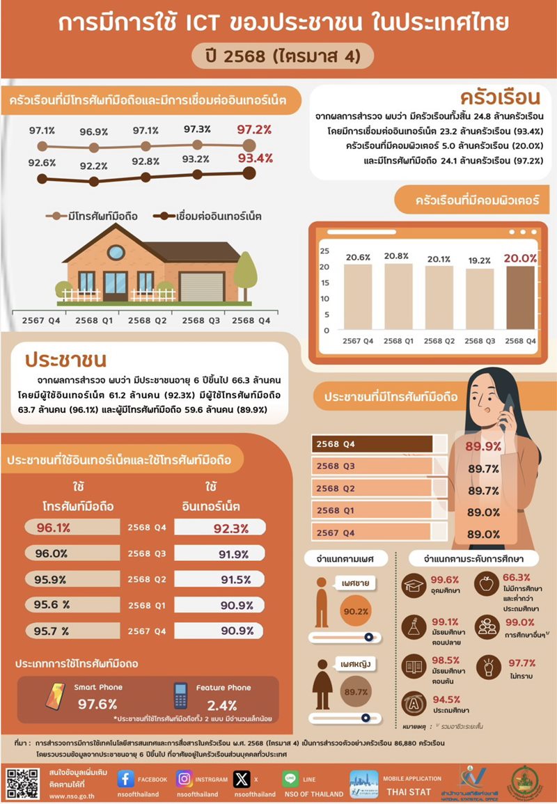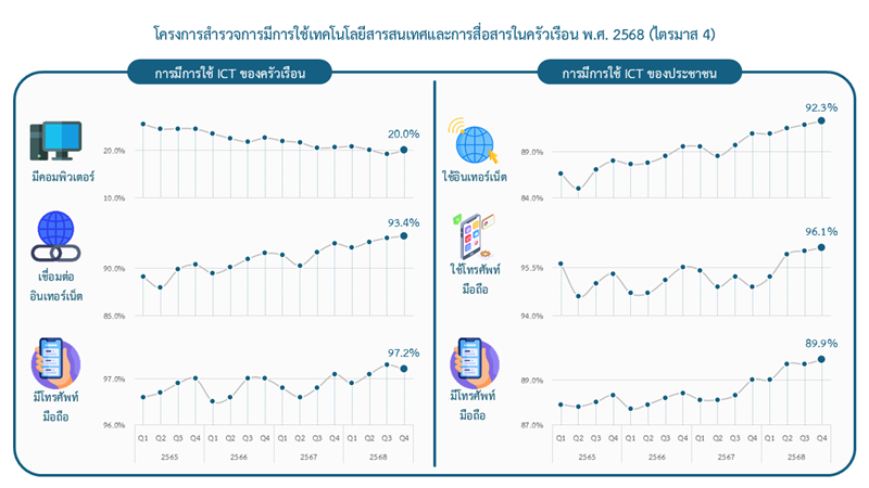 ดร.เอกพงษ์ หริ่มเจริญ ผู้อำนวยการสำนักงานสถิติแห่งชาติ เปิดเผยว่า สำนักงานสถิติแห่งชาติ ได้ทำการสำรวจการมีการใช้เทคโนโลยีสารสนเทศและการสื่อสารในครัวเรือนต่อเนื่องเป็นประจำทุกไตรมาส จากครัวเรือนส่วนบุคคลตัวอย่าง 86,880 ครัวเรือนทั่วประเทศ เพื่อแสดงให้เห็นถึงการใช้งาน และการเข้าถึงโครงสร้างพื้นฐานด้านเทคโนโลยีสารสนเทศและการสื่อสาร ทั้งการใช้อินเทอร์เน็ต การใช้โทรศัพท์มือถือ และการมีโทรศัพท์มือถือของประชาชน รวมถึงการมีคอมพิวเตอร์ การเชื่อมต่ออินเทอร์เน็ต และการมีโทรศัพท์มือถือ ของครัวเรือน ซึ่งผลการสำรวจในไตรมาส 4 ปี 2568 สรุปสาระสำคัญได้ดังนี้