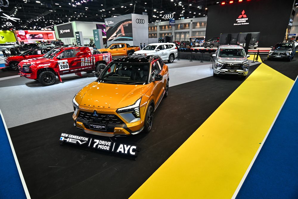 รถยนต์ไฮไลต์ภายในบูธ นำโดย ออล-นิว มิตซูบิชิ เอ็กซ์ฟอร์ส เอชอีวี รถยนต์คอมแพกต์เอสยูวีฟูลไฮบริดรุ่นล่าสุด ที่มียอดส่งมอบแล้วกว่า 10,000 คัน ภายในระยะเวลาเพียง 1 ปี นับตั้งแต่เปิดตัวในประเทศไทย การันตีความคุ้มค่าและคุณภาพด้วยรางวัลรถยนต์ยอดเยี่ยมประจำปี 2568 จากสมาคมผู้สื่อข่าวรถยนต์และรถจักรยานยนต์ไทย (สรยท.) โดยรถยนต์รุ่นนี้มุ่งมอบประสบการณ์ “Xperience the Force” ที่ทั้งขับสนุก เร้าใจ และทรงพลัง ตอบโจทย์สไตล์คนเมือง ด้วย MITSUBISHI e:MOTION ที่ยกระดับการขับขี่ผ่านระบบขับเคลื่อนฟูลไฮบริดเจเนอเรชันใหม่ โหมดการขับขี่ 7 รูปแบบ (7 Drive Mode) และระบบควบคุมการขับเคลื่อนและสมดุลขณะเข้าโค้ง (Active Yaw Control – AYC) ผสานกับช่วงล่างและระบบกันสะเทือนที่พัฒนาขึ้นใหม่ให้เหมาะสมกับสภาพถนนในประเทศไทย จากการทดสอบจริงบนถนนทั่วประเทศรวมระยะทางกว่า 100,000 กิโลเมตร เพื่อมอบความมั่นใจในทุกการเดินทางทั้งในเมืองและนอกเมือง