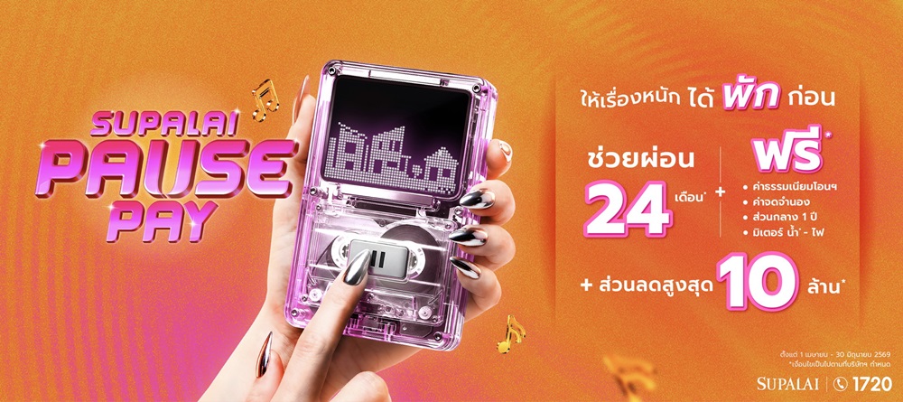 ถึงเวลาของคนอยากมีบ้านที่จะเริ่มต้นได้ง่ายกว่าเดิม กับแคมเปญ “Supalai Pause Pay” เปิดให้จองตั้งแต่วันที่ 1 เมษายน – 30 มิถุนายน 2569 สำหรับโครงการศุภาลัยที่ร่วมรายการทั่วประเทศ ผู้สนใจสามารถ เยี่ยมชมโครงการศุภาลัย เพื่อสัมผัสบ้านพร้อมอยู่ด้วยตัวเอง พร้อมรับโปรโมชันใหญ่แห่งปีที่ช่วยให้การมีบ้านเป็นเรื่องง่ายยิ่งขึ้น ตรวจสอบรายชื่อโครงการบ้านและคอนโดมิเนียมที่เข้าร่วมรายการได้ที่ www.supalai.com, Facebook : Supalai หรือสอบถามข้อมูลเพิ่มเติมโทร. 1720 (* เงื่อนไขเป็นไปตามที่บริษัทฯ กำหนด)