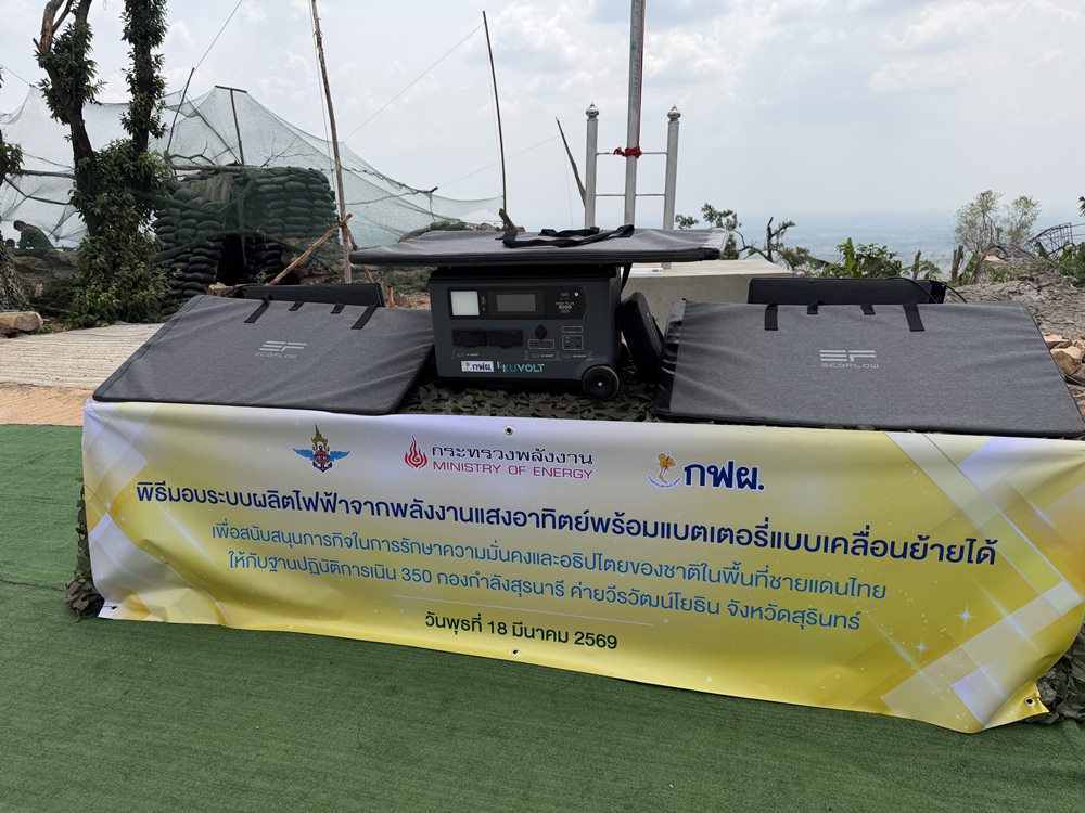 พล.ท.อดุลย์ บุญธรรมเจริญ รัฐมนตรีช่วยว่าการกระทรวงกลาโหม พร้อมด้วย นางพัทธ์ธีรา สายประทุมทิพย์ ผู้ตรวจราชการกระทรวงพลังงาน และนายศิริวัฒน์ เจ็ดสี รองผู้ว่าการพัฒนาโรงไฟฟ้าและพลังงานหมุนเวียน การไฟฟ้าฝ่ายผลิตแห่งประเทศไทย (กฟผ.) ร่วมส่งมอบระบบโซลาร์เซลล์พร้อมแบตเตอรี่แบบเคลื่อนย้ายได้ เพื่อสนับสนุนภารกิจความมั่นคงชายแดนไทย-กัมพูชา แก่กองกำลังสุรนารี ณ ฐานปฏิบัติการเนิน 350 จ.สุรินทร์ เมื่อวันที่ 18 มีนาคม 2569