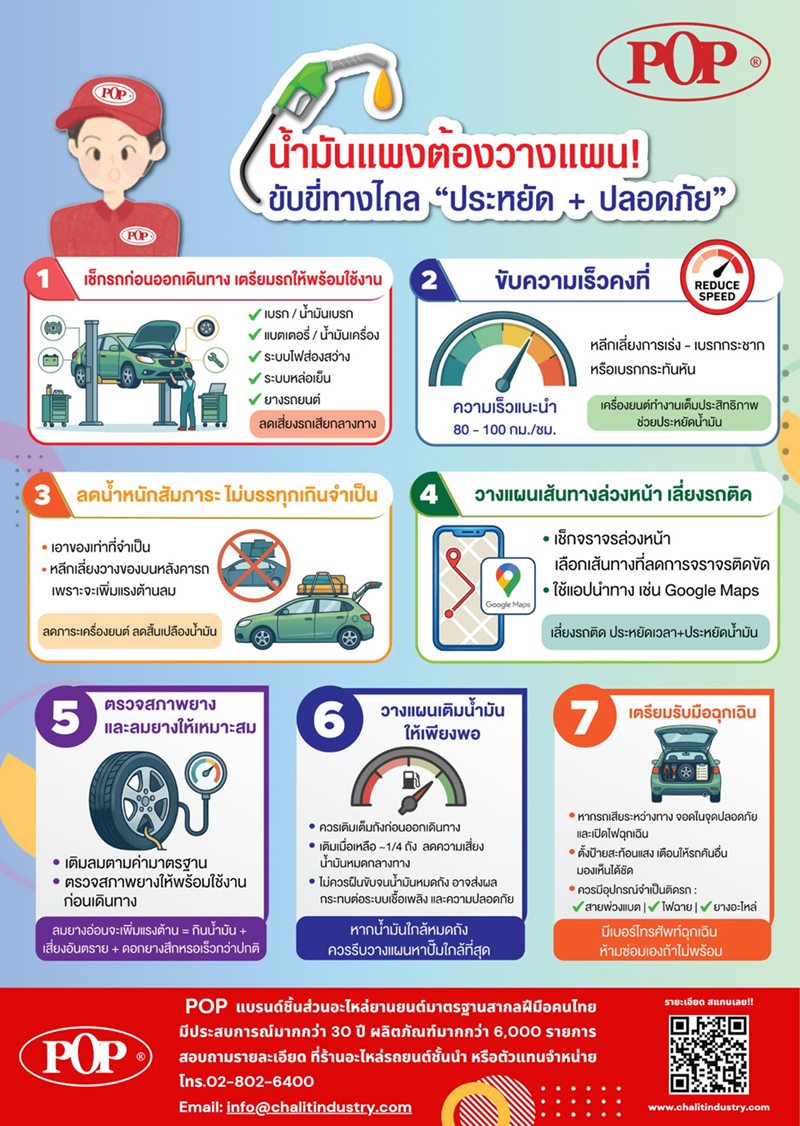 ช่วงเทศกาลสงกรานต์ถือเป็นฤดูกาลแห่งการเดินทางของคนไทย หลายครอบครัวเลือกใช้รถยนต์ส่วนตัวเพื่อกลับภูมิลำเนาหรือท่องเที่ยวต่างจังหวัด อย่างไรก็ตาม ในภาวะที่ราคาน้ำมันปรับตัวสูงขึ้น การขับรถทางไกลในปัจจุบันจึงไม่ใช่เพียงเรื่องความสะดวกสบายเท่านั้น หากยังต้องคำนึงถึงทั้ง “ความประหยัดน้ำมัน” และ “ความปลอดภัย” เพื่อให้การเดินทางราบรื่นตลอดเส้นทาง ผู้ขับขี่จึงควรเตรียมความพร้อมของรถก่อนออกเดินทาง และปรับพฤติกรรมการขับขี่ เพื่อลดค่าใช้จ่ายและลดความเสี่ยงรถเสียระหว่างการเดินทางข้อมูลจาก นายชวิศ ยงเห็นเจริญ กรรมการผู้จัดการ บริษัท ชลิต อินดัสทรี จำกัด ผู้ผลิตและจัดจำหน่ายชิ้นส่วนอะไหล่ยานยนต์มาตรฐานสากลฝีมือคนไทย ภายใต้แบรนด์ “POP” ซึ่งอยู่ในอุตสาหกรรมยานยนต์ไทยมากกว่า 30 ปี เปิดเผยว่า ปัญหาที่มักพบในช่วงเดินทางเทศกาลสงกรานต์คือ สภาพการจราจรติดขัดต่อเนื่อง ส่งผลให้เครื่องยนต์ทำงานหนัก เกิดความร้อนสะสมสูง ขณะเดียวกันผู้ขับขี่ก็โอกาสเกิดความเหนื่อยล้า ซึ่งล้วนเป็นปัจจัยเสี่ยงด้านความปลอดภัยโดยตรง