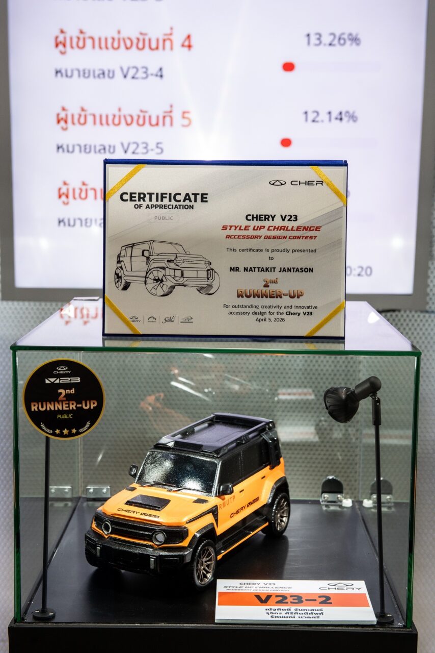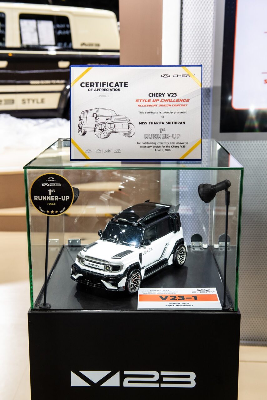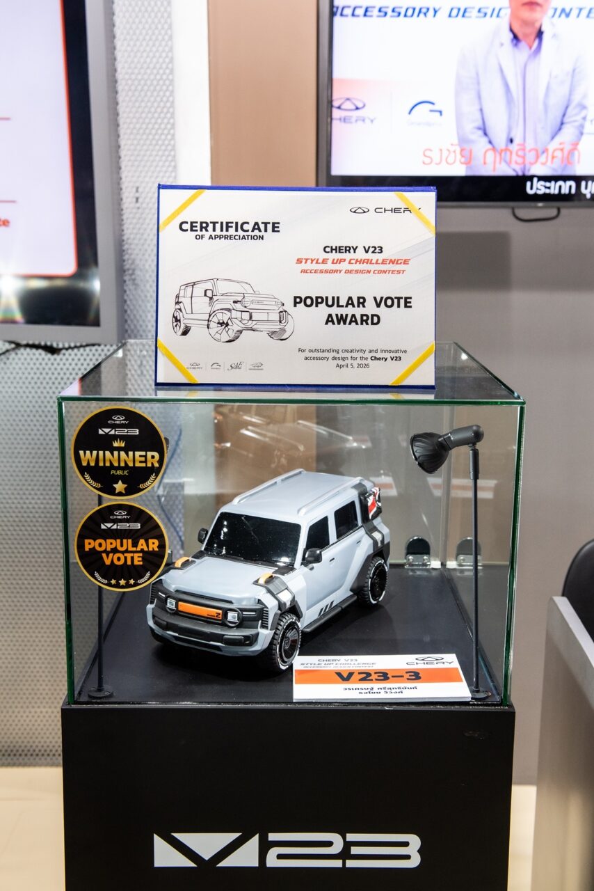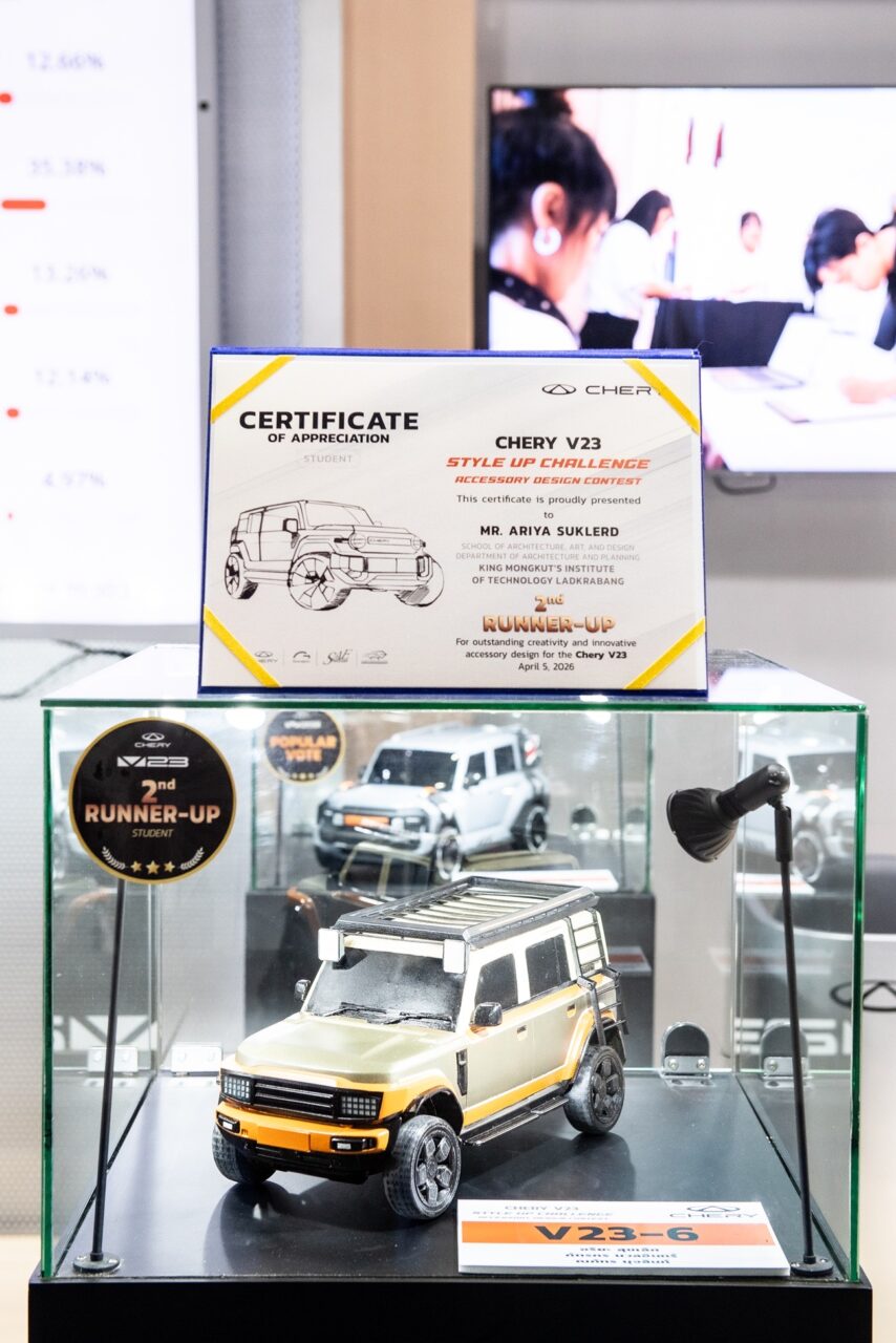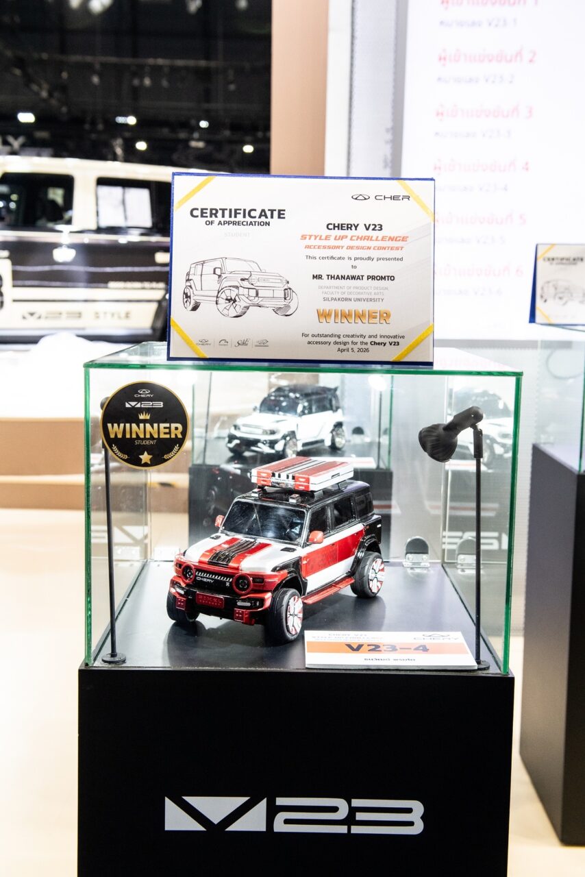 เชอรี ประเทศไทย ร่วมกับ สมาคมวิศวกรรมยานยนต์ไทย บริษัท กรังด์ปรีซ์ อินเตอร์เนชั่นแนล จำกัด (มหาชน) และสมาคมผู้สื่อข่าวรถยนต์และรถจักรยานยนต์ไทย(สรยท.) จัดพิธีมอบรางวัลโครงการประกวดออกแบบอุปกรณ์ตกแต่งรถยนต์ “Chery V23 Style Up Challenge” อย่างเป็นทางการ ณ บูธรถยนต์ CHERY ภายในงานบางกอก อินเตอร์เนชั่นแนล มอเตอร์โชว์ ครั้งที่ 47 อาคารชาเลนเจอร์ 1–3 อิมแพ็ค เมืองทองธานี เมื่อวันที่ 5 เมษายน 2569 ท่ามกลางบรรยากาศคึกคัก โดยมีผู้บริหาร พันธมิตรในอุตสาหกรรม และสื่อมวลชนร่วมเป็นสักขีพยาน