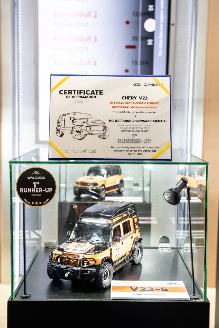ทั้งนี้ โครงการ “Chery V23 Style Up Challenge” สะท้อนทิศทางของเชอรีที่เติบโตไปพร้อมกับความคิดสร้างสรรค์ของนักออกแบบไทยดึงแรงบันดาลใจไปสร้างสรรค์เป็นการออกแบบ พร้อมเปลี่ยนไอเดียสู่การผลิตจริง ถือเป็นอีกหนึ่งเวทีสำคัญในการส่งเสริมศักยภาพด้านการออกแบบยานยนต์ของคนรุ่นใหม่ พร้อมต่อยอดสู่เวทีระดับสากล และสะท้อนถึงความมุ่งมั่นในการพัฒนาอุตสาหกรรมยานยนต์ไทยอย่างยั่งยืน