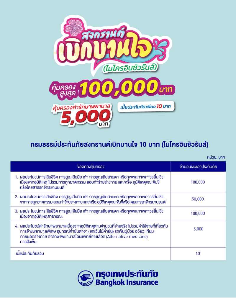 • กรมธรรม์ประกันภัยสงกรานต์เบิกบานใจ 10 บาท (ไมโครอินชัวรันส์