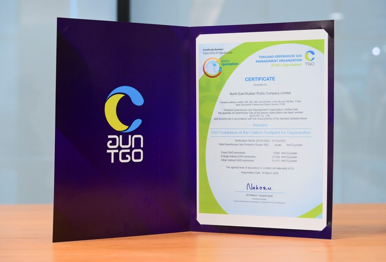 นายจิรายุส จึงธนสมบูรณ์ ผู้ช่วยประธานเจ้าหน้าที่บริหาร บริษัท นอร์ทอีส รับเบอร์ จำกัด (มหาชน) หรือ NER ผู้ผลิตและจำหน่ายผลิตภัณฑ์ยางสำหรับอุตสาหกรรมยานยนต์ทั้งในและต่างประเทศ เป็นตัวแทนเข้ารับเกียรติบัตรเครื่องหมายคาร์บอนฟุตพริ้นท์ขององค์กร ตอกย้ำความมุ่งมั่นด้านการดำเนินธุรกิจอย่างยั่งยืน ซึ่งสะท้อนถึงการบริหารจัดการการปล่อยก๊าซเรือนกระจกอย่างเป็นระบบ