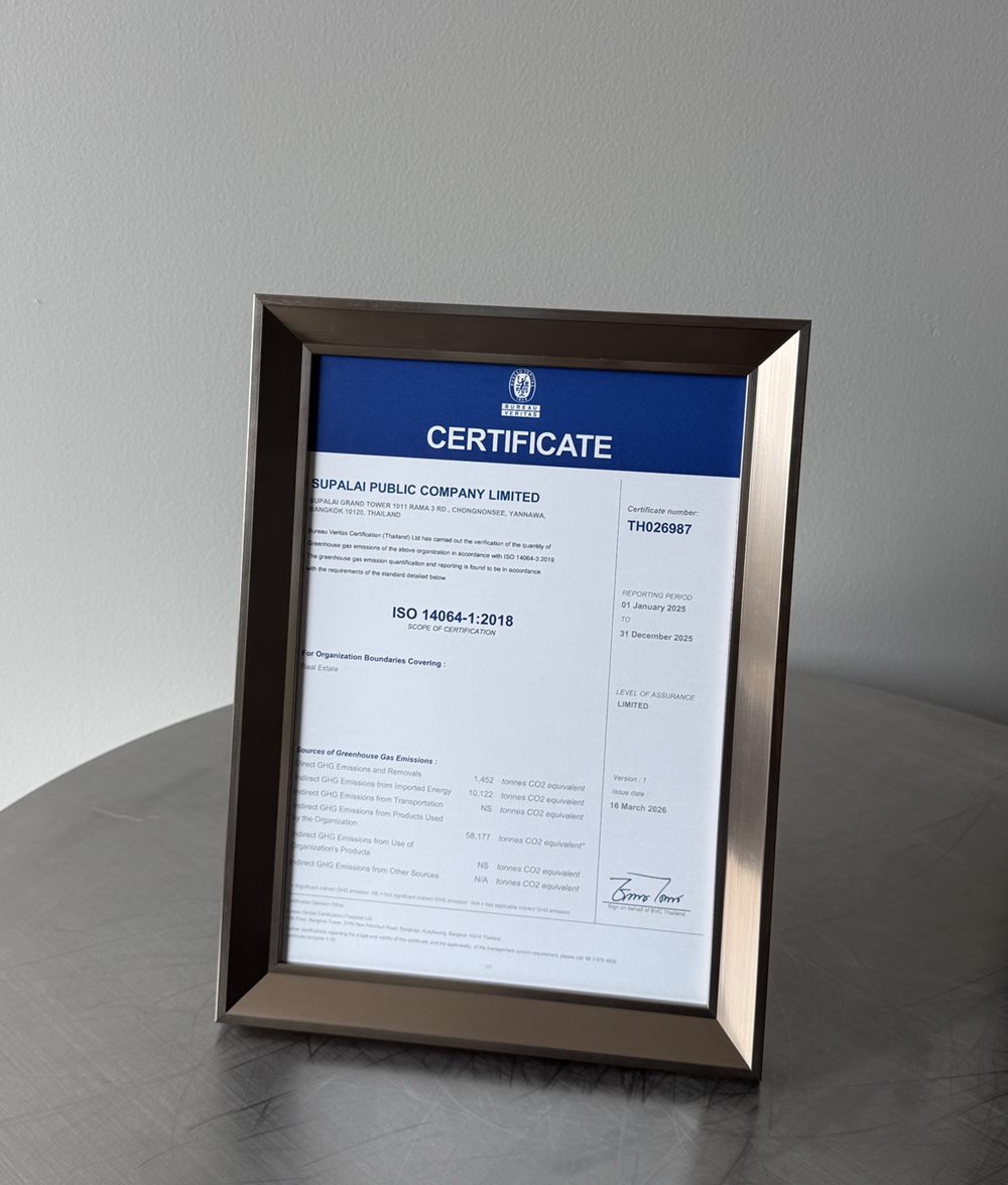 ประกาศนียบัตรรับรองระบบมาตรฐานสากล ISO 14064-1:2018 การรายงานผลการปล่อยปริมาณก๊าซเรือนกระจกของระดับองค์กร จาก นายศราวุธ ศุภรัตนชาติพันธ์ ผู้อำนวยการฝ่ายธุรกิจการรับรองระบบมาตรฐาน บริษัท บูโร เวอริทัส เซอทิฟิเคชั่น (ประเทศไทย) จำกัด (ซ้าย) พร้อมด้วย นายวิวัฒน์ โฆษิตสกุล กรรมการผู้จัดการ บริษัท แอดวานซ์ เอ็นเนอร์ยี่ พลัส จำกัด (ขวา) ในฐานะที่ปรึกษาการจัดทำรายงานการปล่อยก๊าซเรือนกระจกขององค์กรเข้าร่วมแสดงความยินดีในความสำเร็จครั้งนี้ ณ อาคารศุภาลัย แกรนด์ ทาวเวอร์ ทั้งนี้ บริษัทฯ ได้รับการรับรองต่อเนื่องเป็นปีที่ 3 สะท้อนความมุ่งมั่นในการดำเนินธุรกิจอย่างโปร่งใสและเป็นมิตรต่อสิ่งแวดล้อม